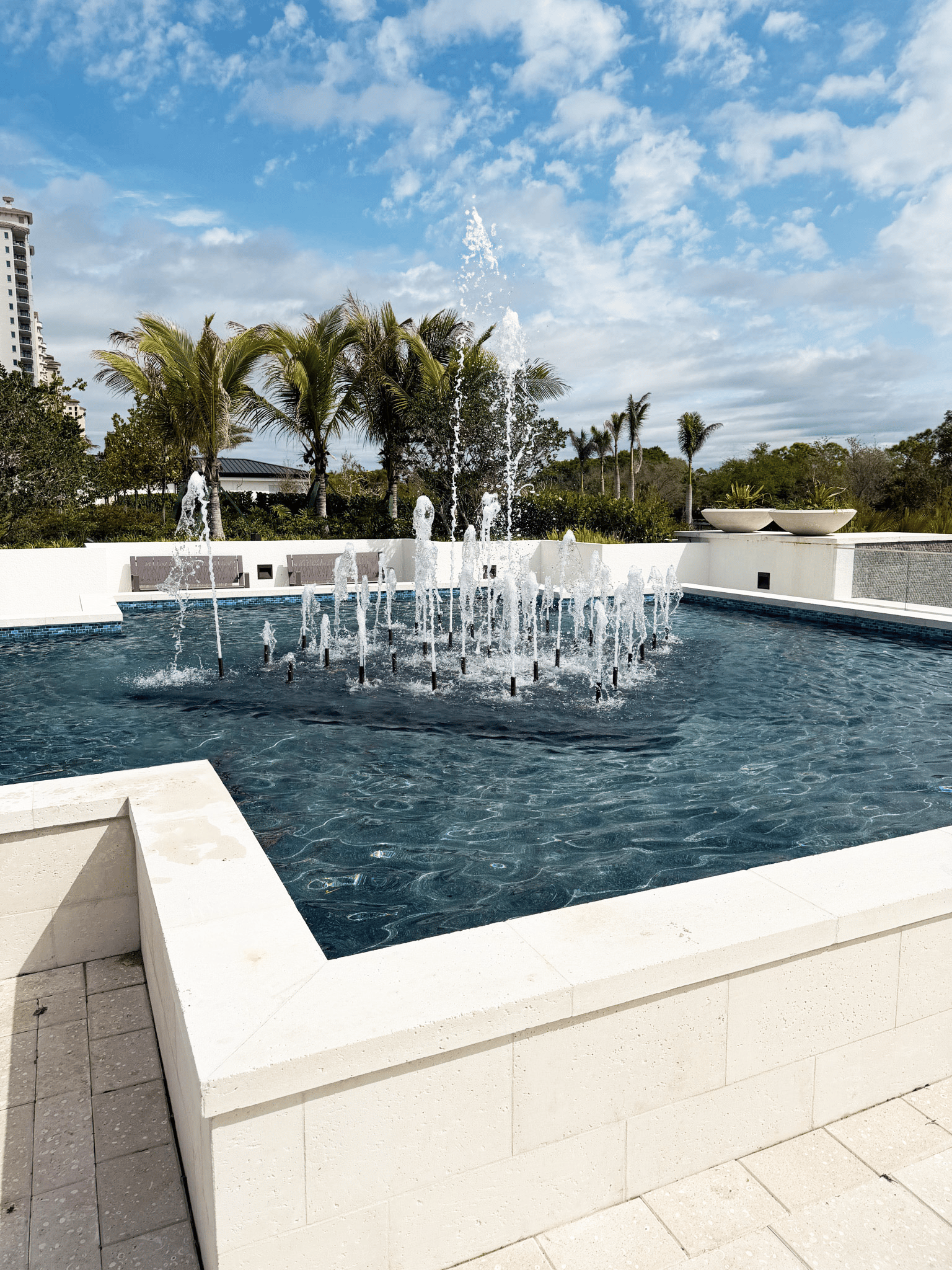 Located within this luxury condo development in Bonita Springs, Infinity delivers a high-rise living experience designed for an active, social lifestyle. With a focus on resort-style amenities and a relaxed, “Palm Beach-inspired” aesthetic, the space reflects both energy and coastal charm. Welcoming residents and guests towards the entrance lies the Infinity Nozzle Fountain, setting the tone for the building’s modern elegance and inviting atmosphere.